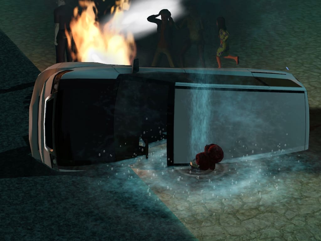 Two bot officers, who I guessed must have been the ones escorting the prisoners, were standing near the car attempting to extinguish the flames and there was a small crowd of humans running around the car attempting to rescue anyone who may have been inside.