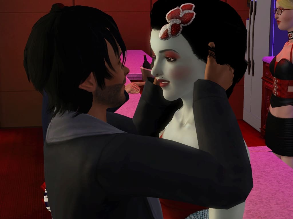 He pulled her closer into an embrace. She reacted with a satisfied smile. She knew that she had him.