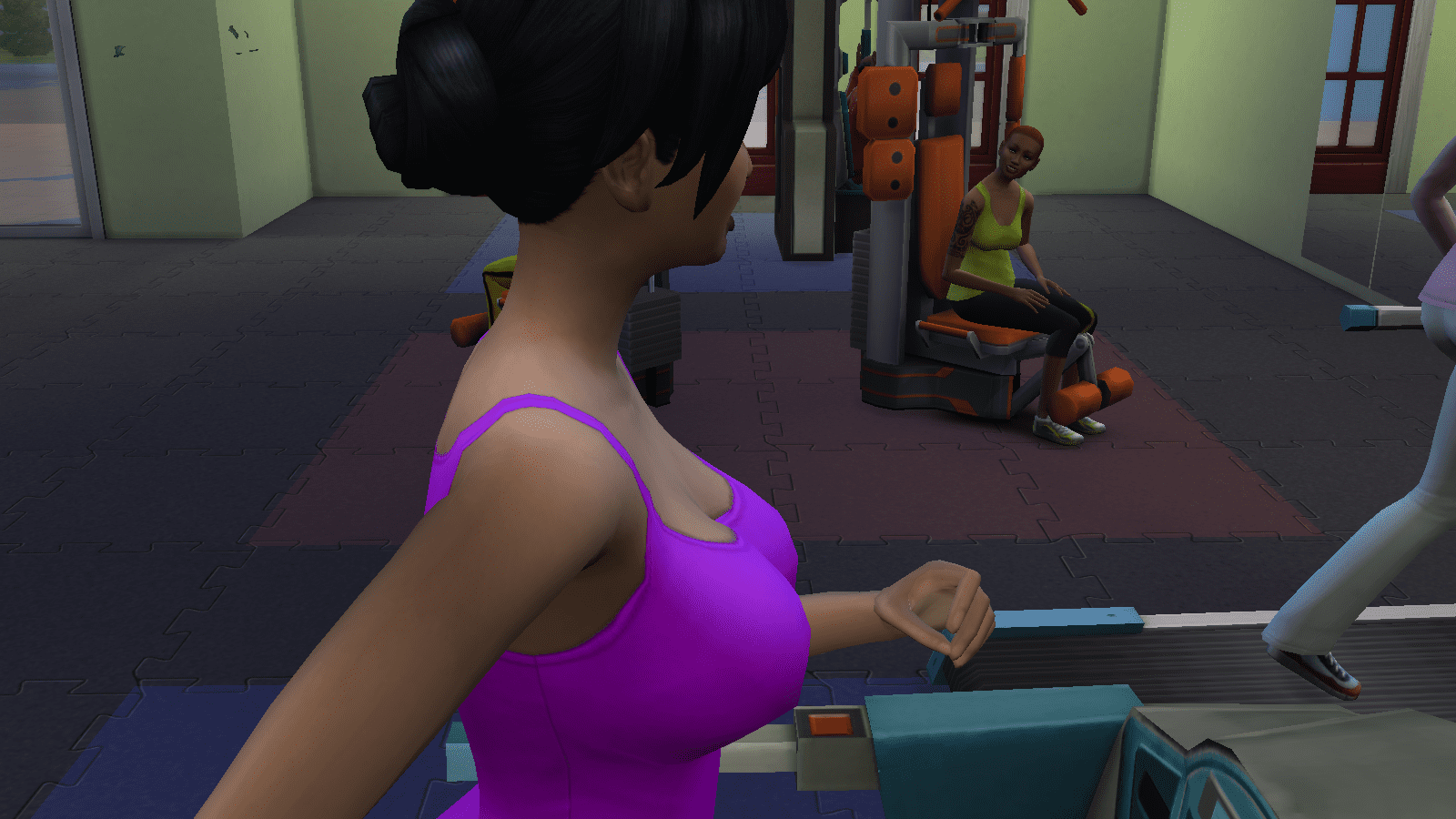 Dude is totally checking out Mitzi’s butt, but she’s oblivious as she chats with the ladies on the other treadmills.