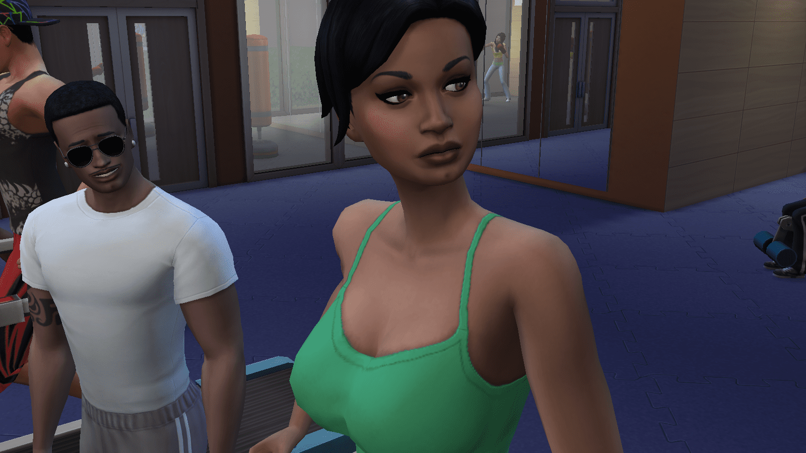 Mitzi ignores the guy for the duration of her workout. He doesn’t leave and she doesn’t exactly tell him to go away. Mitzi becomes self-conscious when she turns off the treadmill because she knows that she’s smelly and she doesn’t want the guy to pick up on that. He finally walks away as she gets off the treadmill. She’s about to go in the other direction, but changes her mind…