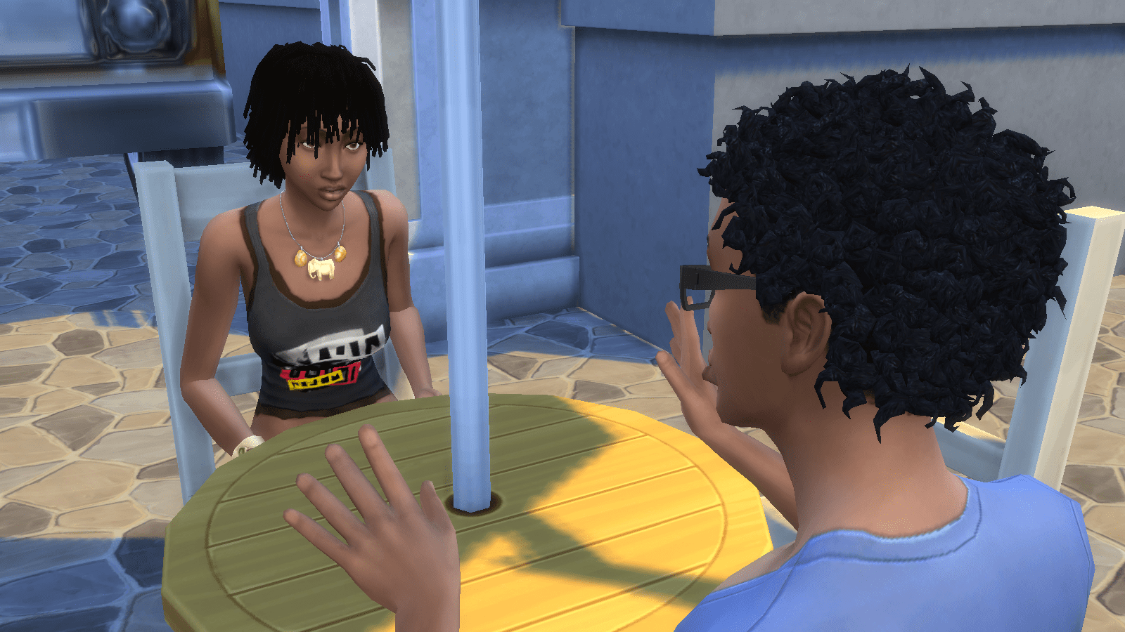 Greg and Ebony go out back to the patio.