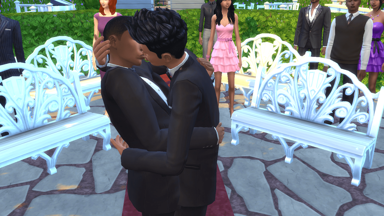 Greg gives his new husband a quick kiss before the two of them head over to the reception area. They opted out of the traditional wedding cake since Ray isn’t around to make one (actually I forgot to have one of them bake a cake).