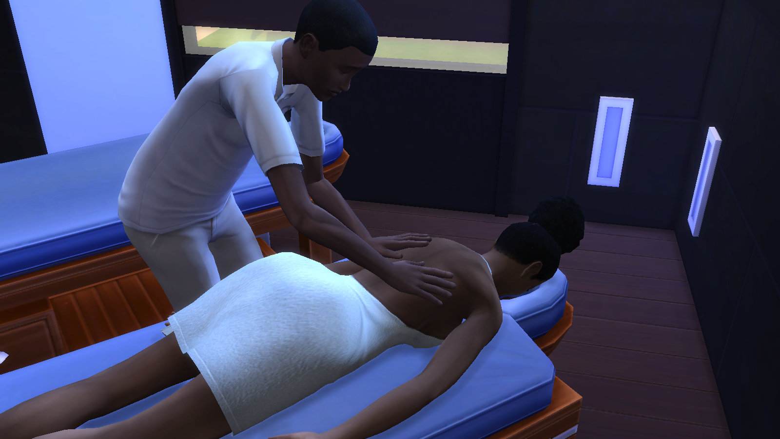 Todd peels his eyes away from Kisha’s butt and begins the massage.