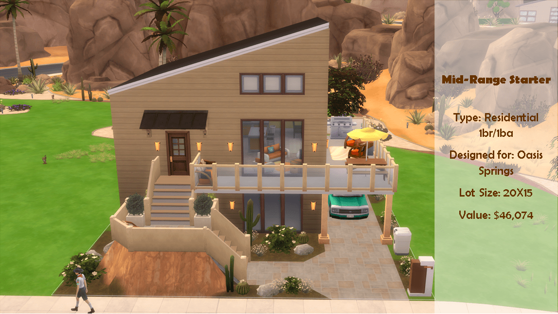 A mid-range starter for those who’ve been moving up in their career and are ready for an upgrade. This one bedroom, one bath contemporary home with carport, outdoor terrace and huge unfinished basement (bottom floor) offers plenty of room to upgrade into a family home. No CC, turn on bb.moveobjects cheat.