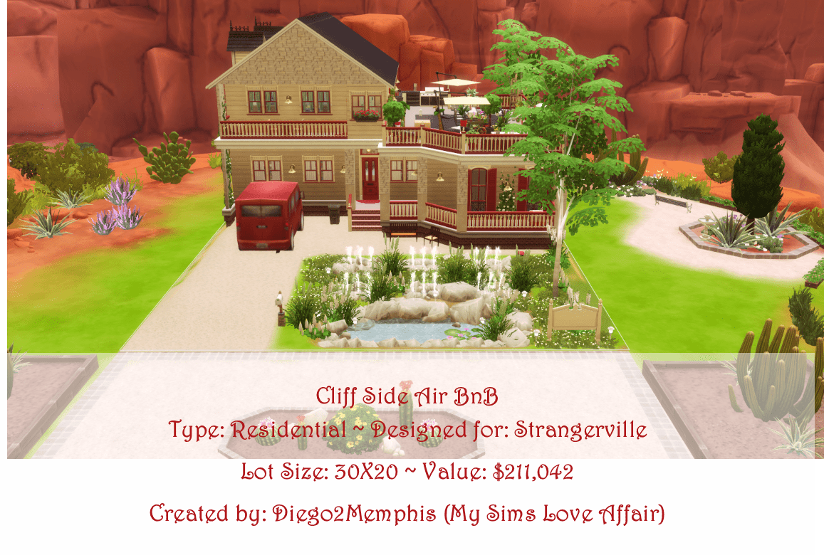 The perfect vacation home for a big family. Three bedroom, 3.5 bath home sleeps up to 7. Home offers the best views in town and features a huge basement with a full gym, pool, hot tub, steam room, and a movie theater. Upstairs there’s a huge patio where the family can host parties while enjoying the view. No CC, but must turn on bb.moveobjects cheat to keep everything as intended.