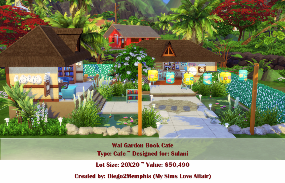 Designed to be a quiet, peaceful spot for book and coffee lovers in Sulani. Built on the Tangled Flat lot in Ohan’ali. No CC, but contains resized objects. Turn on bb.moveobjects cheat before placing in build mode.
