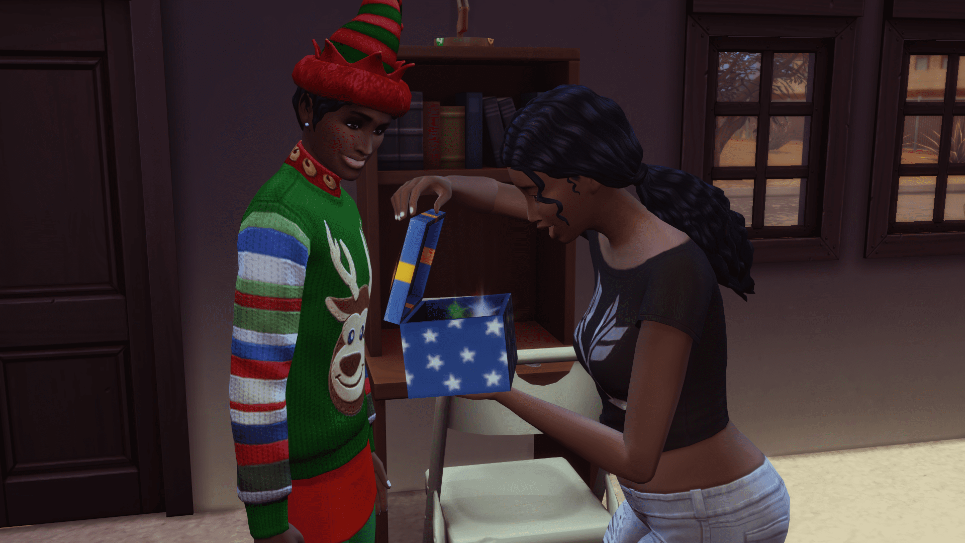 I open the gift and see that it’s an ugly Winterfest sweater and a hat to go with hers.
