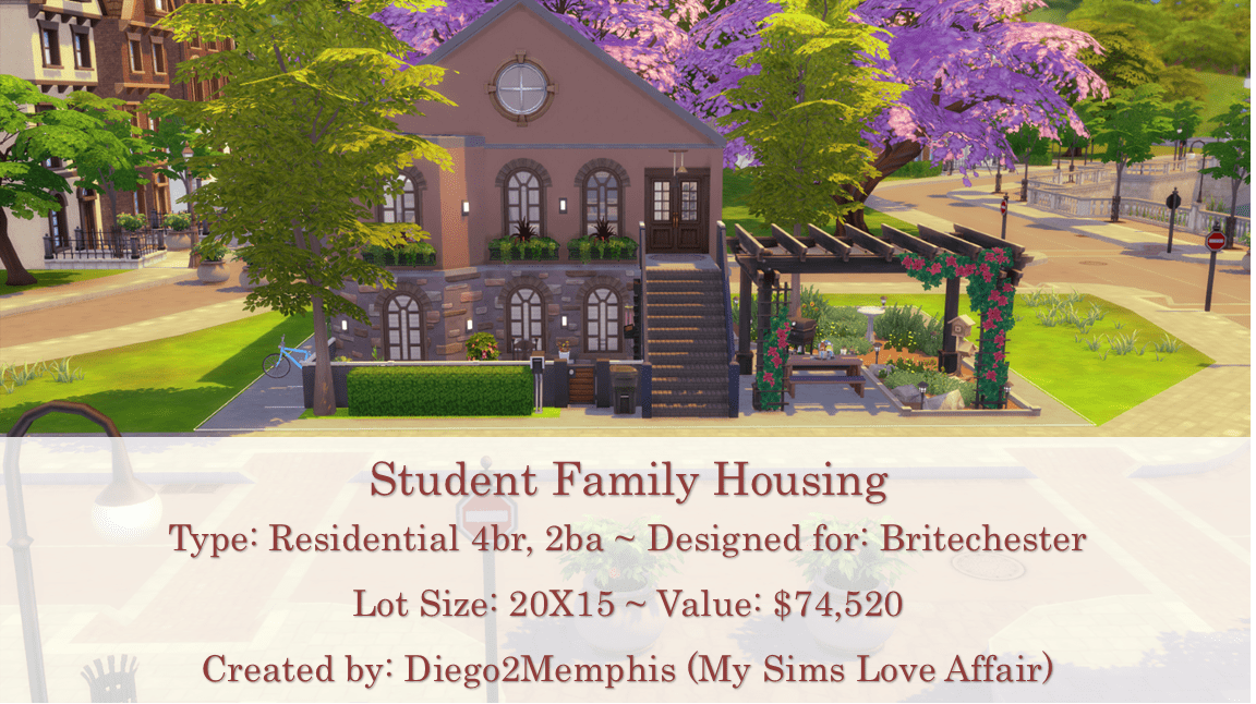 This four bedroom, two bath student housing is designed with a small family in mind. Divided into two units, the downstairs can be rented out to roommates while a family of two or three (including a toddler) can live upstairs. No CC, please turn on bb.moveobjects cheat before placing.