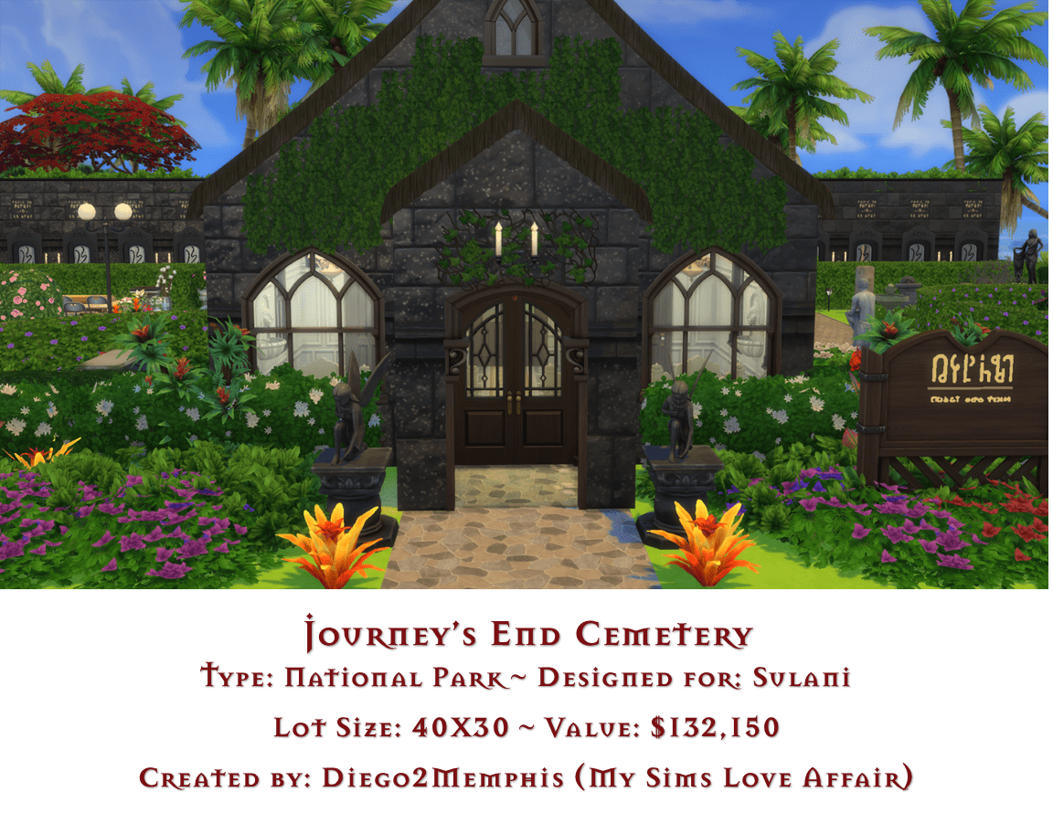A peaceful location in which to bury dearly departed sim relatives. Features individual family mausoleums. Plenty of locations to reflect and remember loved ones that have passed away. Designed for Sulani, but can be used in any world. No CC, but contains hidden and resized objects. Turn on bb.moveobjects cheat before placing lot.