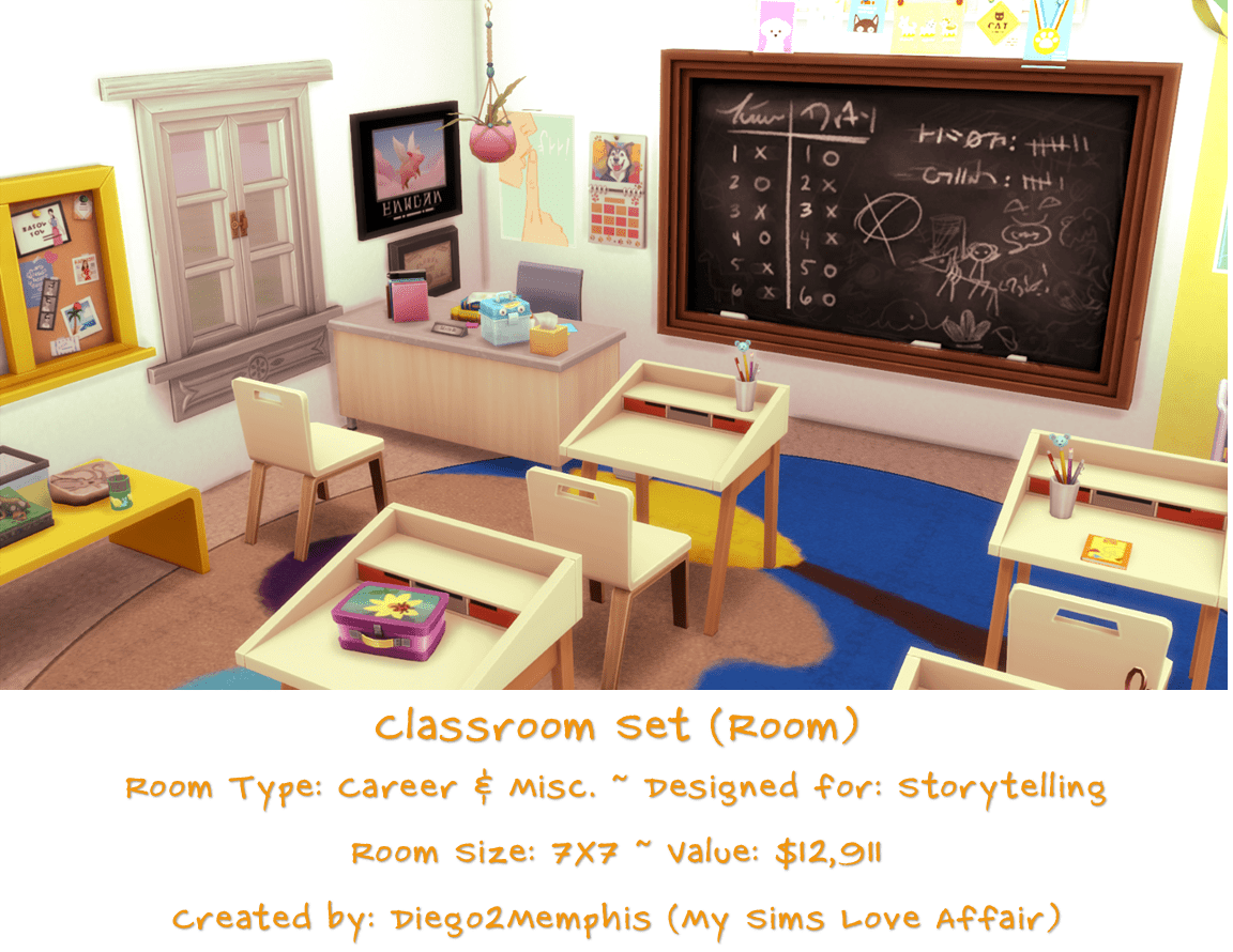 A classroom setting designed for storytelling and/or gameplay. No CC but uses hidden and resized objects, turn on bb.moveobjects cheat when placing. Seen in this post: Banks Dynasty – Day 25.2 (Part 1)