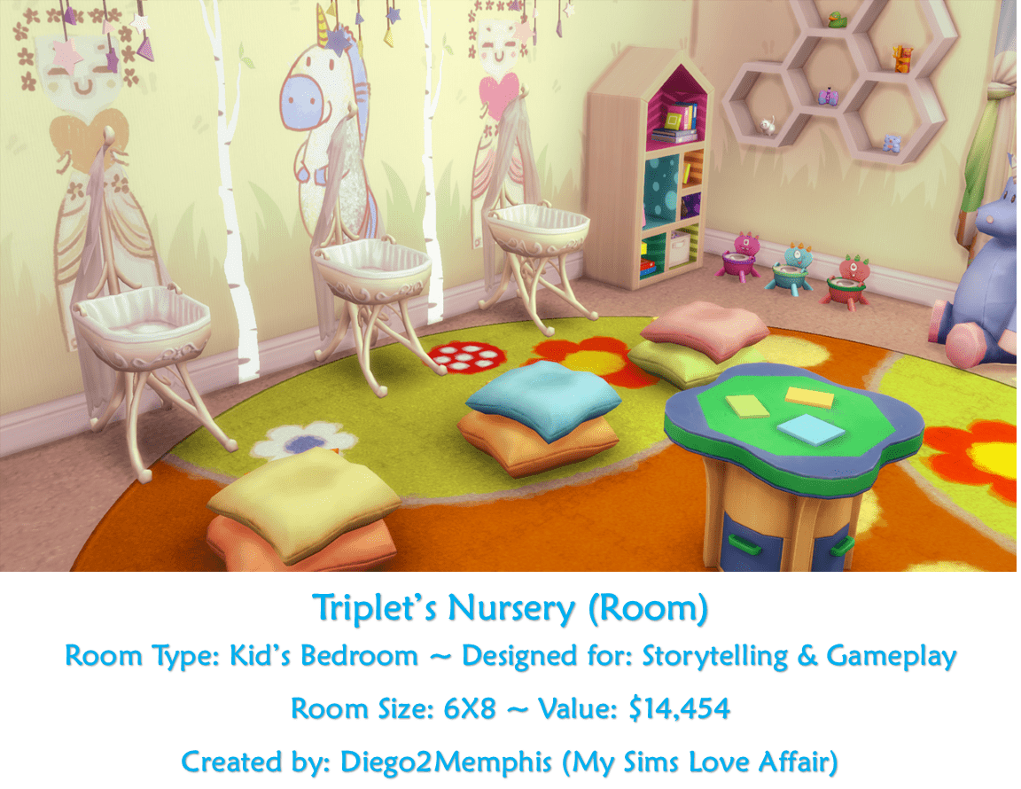A bedroom designed for three babies and later, three toddlers. No CC, turn on bb.moveobjects cheat before placing. Seen in this post: After the Costumes (Part 13)
