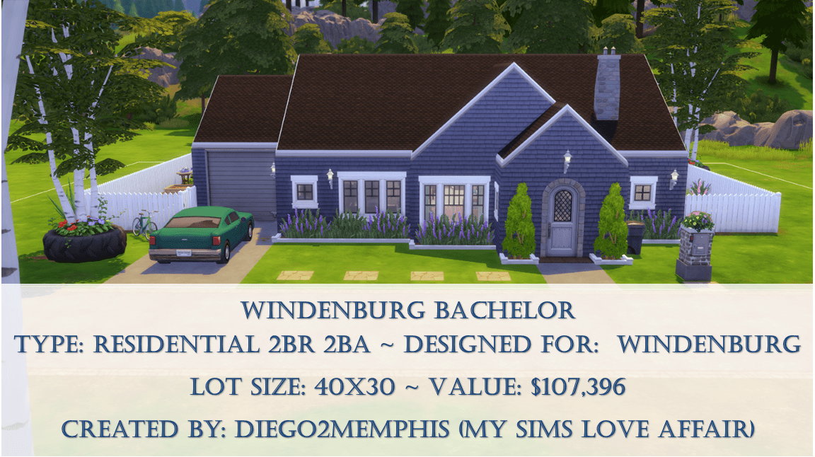 A 2 br, 2 ba home with a single man and his dog in mind. Features a large fenced backyard, garage, office/den, guest bedroom, and master suite. No CC but includes hidden objects, turn on bb.moveobjects when placing.