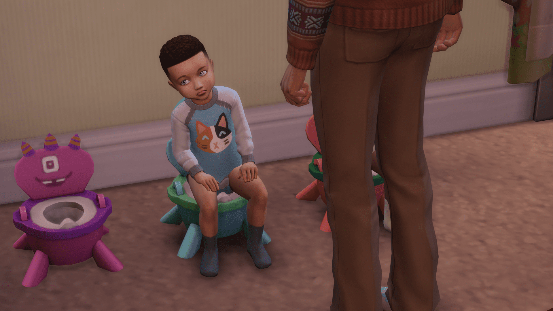 He immediately sits them down on their potties. Lia is fully potty trained, but Jay still struggles a bit.