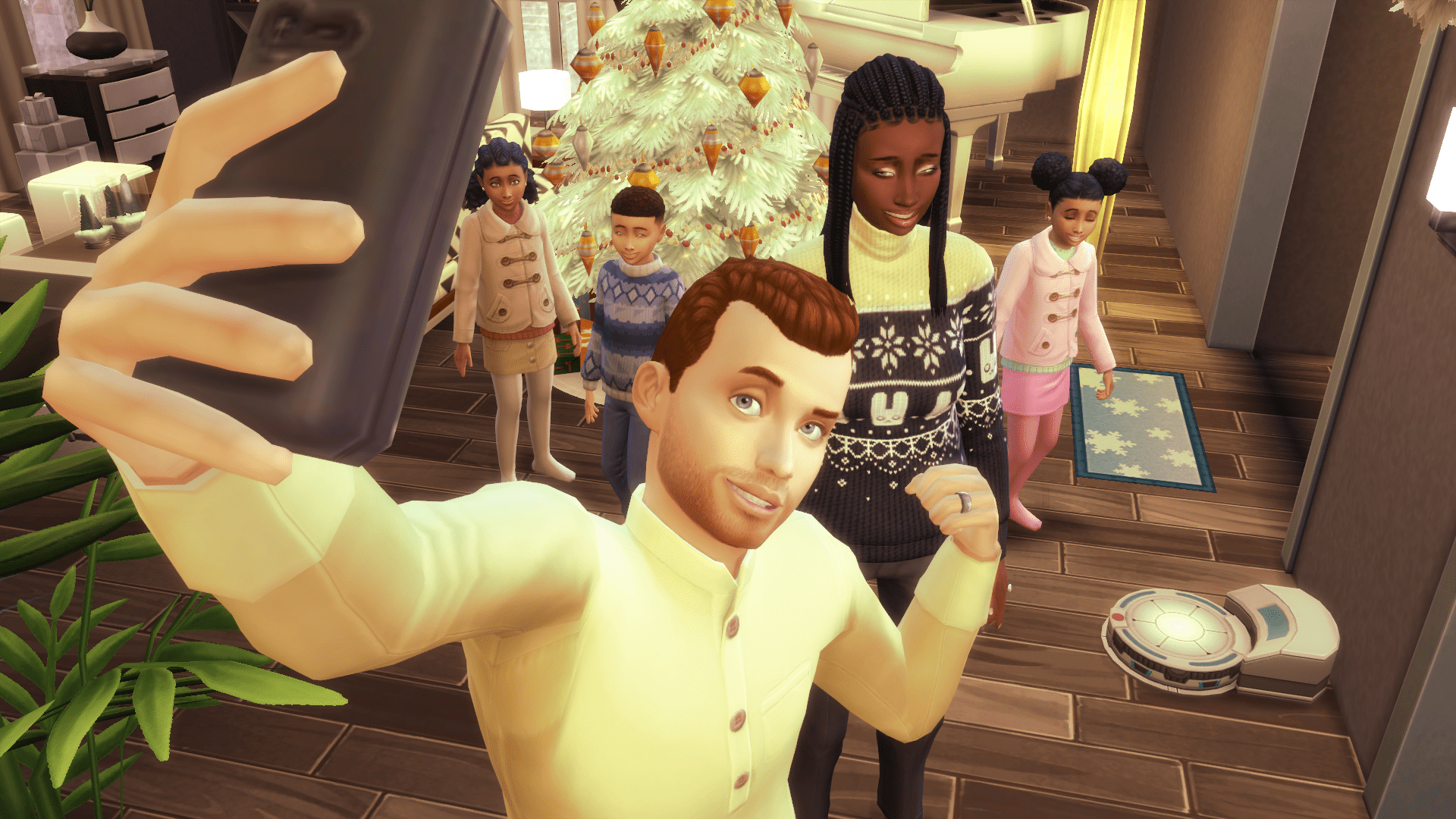 Jalisa and the triplets cheer once the power is restored. They stand and admire the fully lit tree. Merlin returns and pulls out his cell phone.