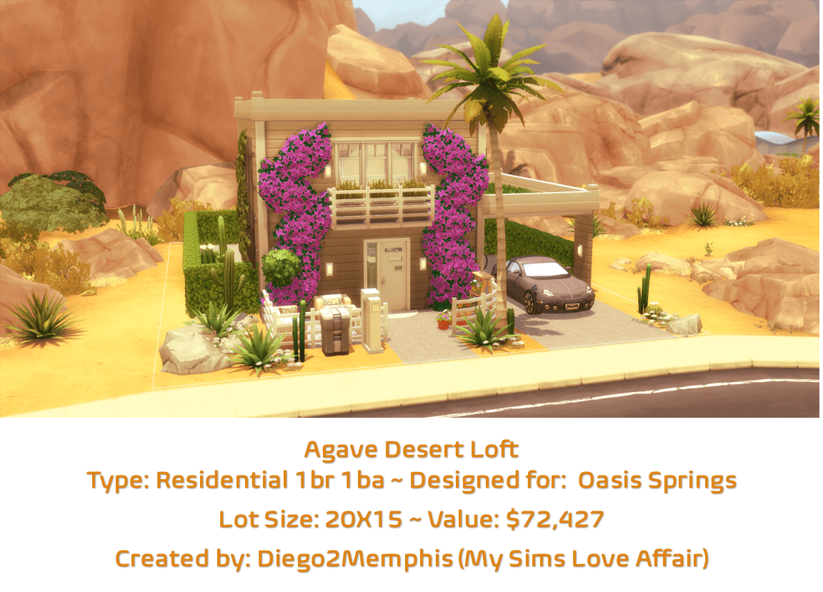 A small desert loft designed for a single sim or couple. This small home makes up for its lack of size with plenty of windows and a beautiful backyard with pool. No cc, but please turn on bb.moveobjects cheats before placing this lot.