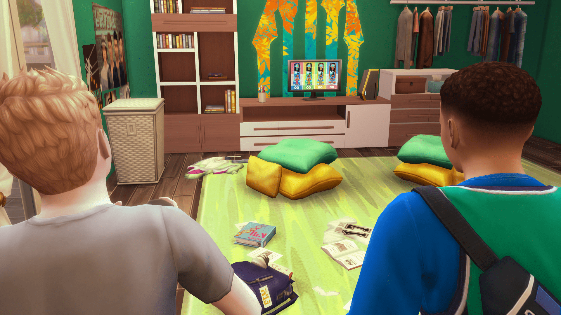 Having his own bedroom without his sisters to help keep it clean means that Jalin’s Slob trait gets to make its debut. He also has the Loves the Outdoors trait, Gregarious trait, and the Party Animal aspiration.