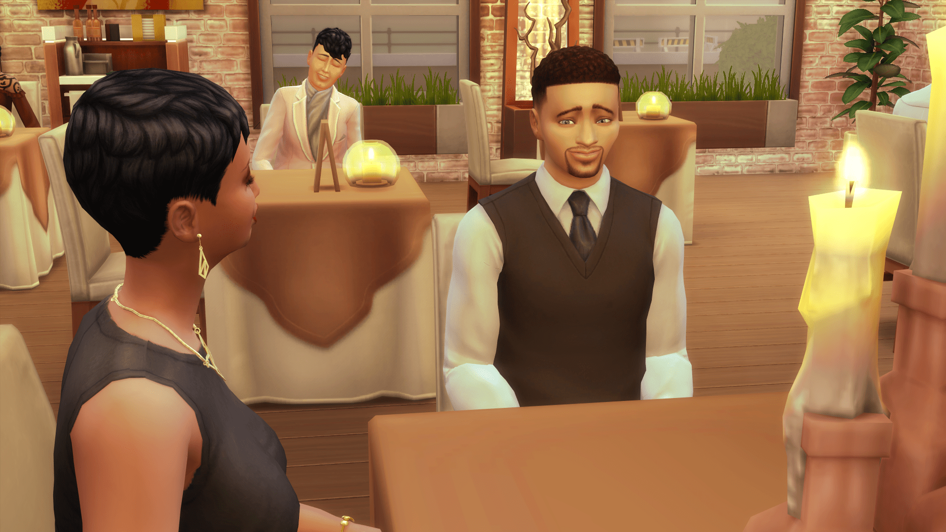 The family travels to a restaurant in San Myshuno after leaving the cemetery. Ma secures a table, and we all sit down.