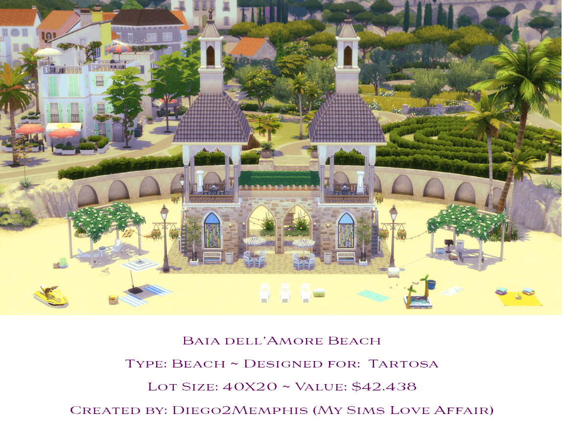 A romantic, but also family-friendly beach location. Features activities for the kids, a grill, vending, plenty of seating for fun in the sun and/or shade. No CC, turn bb.moveobjects cheat before placing.