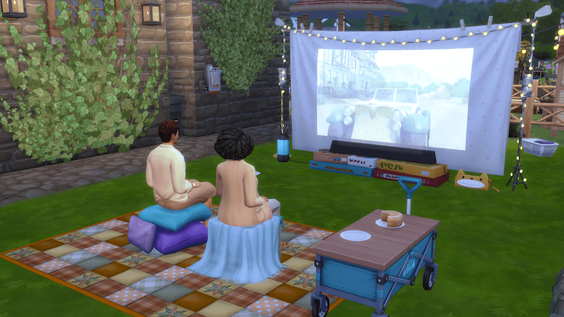 During our first actual date, Me-Me and I attended a movie, even though we talked and got to know each other most of the way through it. So I think that maybe I’ll try and recreate that evening. But it’s nice outside, and it would be a shame not to enjoy it. I run off to the side of the house and put together a makeshift movie screen. I also set up some seating. It might be a fun way to celebrate. Luckily, the delivery arrives just as I’m finishing up.