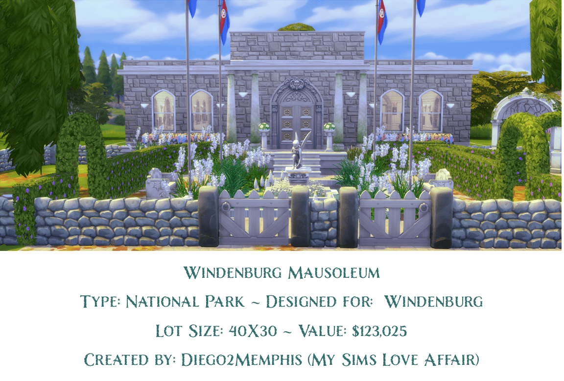 A final resting place for sim loved ones. Includes a small chapel to host funerals and memorials, an organ, and a picnic area. No CC, turn on bb.moveobjects cheat before placing.