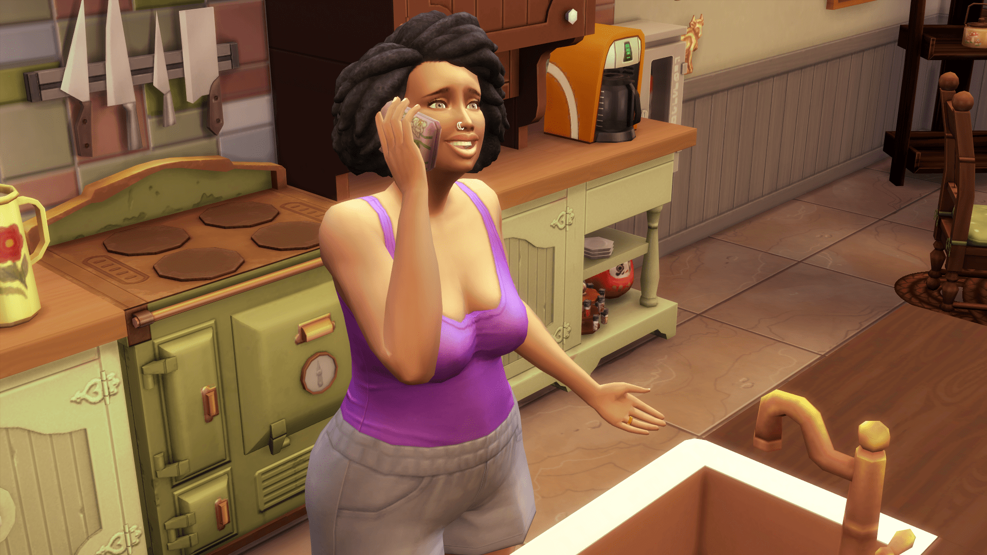 Me-Me is inside helping Peri clean up the kitchen in preparation for dinner. She receives a call from her brother, Jay, in the midst of it.