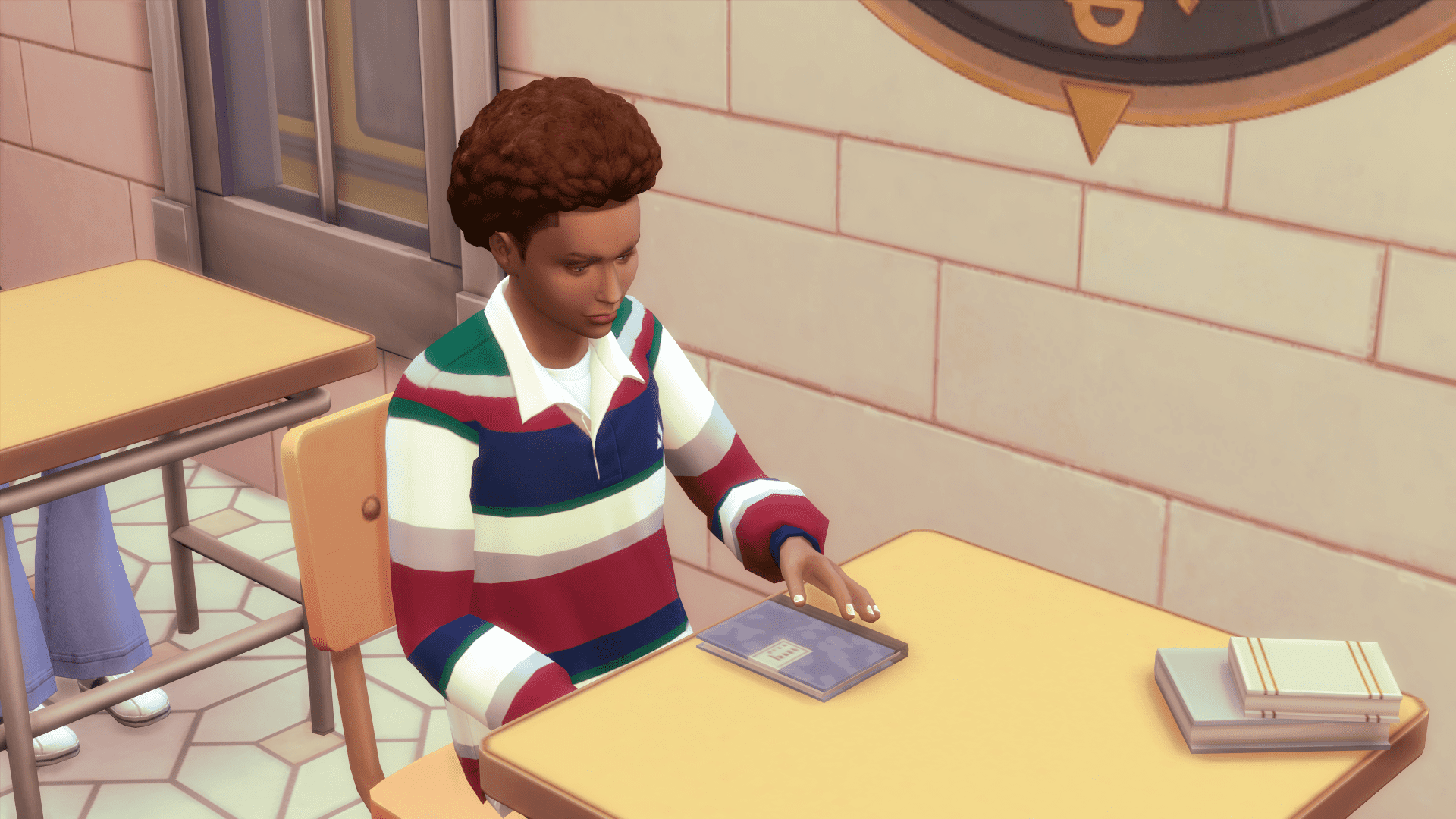 He doesn’t see anyone he knows, but a cute girl sitting alone at one of the tables grabs his attention. He never had trouble getting to know girls at his old school; maybe it could be the same here. He walks over and sits down but suddenly feels a little shy.