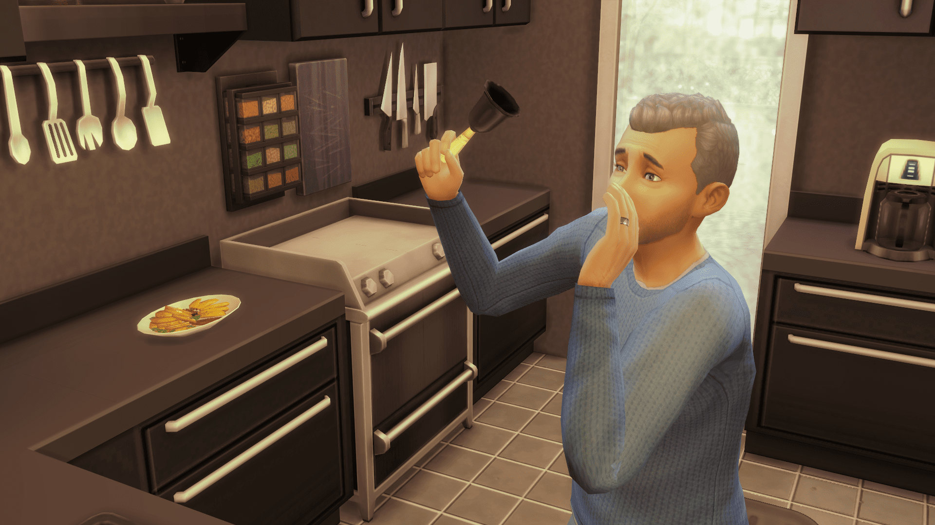 Poor Dray is exhausted from today’s events, so he crashes on one of the chairs in the living room. I go into the kitchen and find Merlin preparing a big breakfast.