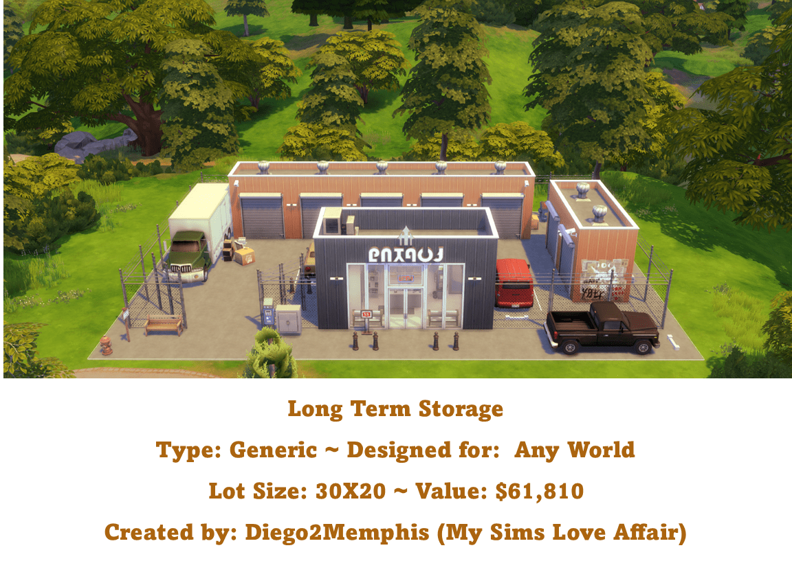 A long-term storage facility. Created for storytelling purposes. No CC, turn on bb.moveobjects cheat