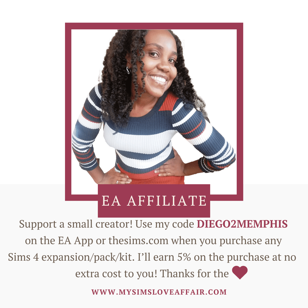 If anything I’ve written, built, or created has touched or helped you, please consider using my promo code DIEGO2MEMPHIS with any of your EA app or thesims.com Sims 4 purchases (I’ll earn 5% of the sale). And it’s the perfect time to use it because the Sims 4 Summer Sale is happening now! Select Sims 4 expansions/game packs/stuff packs/ & kits are marked down between 30 – 60% off until July 11th, 10 am PT!