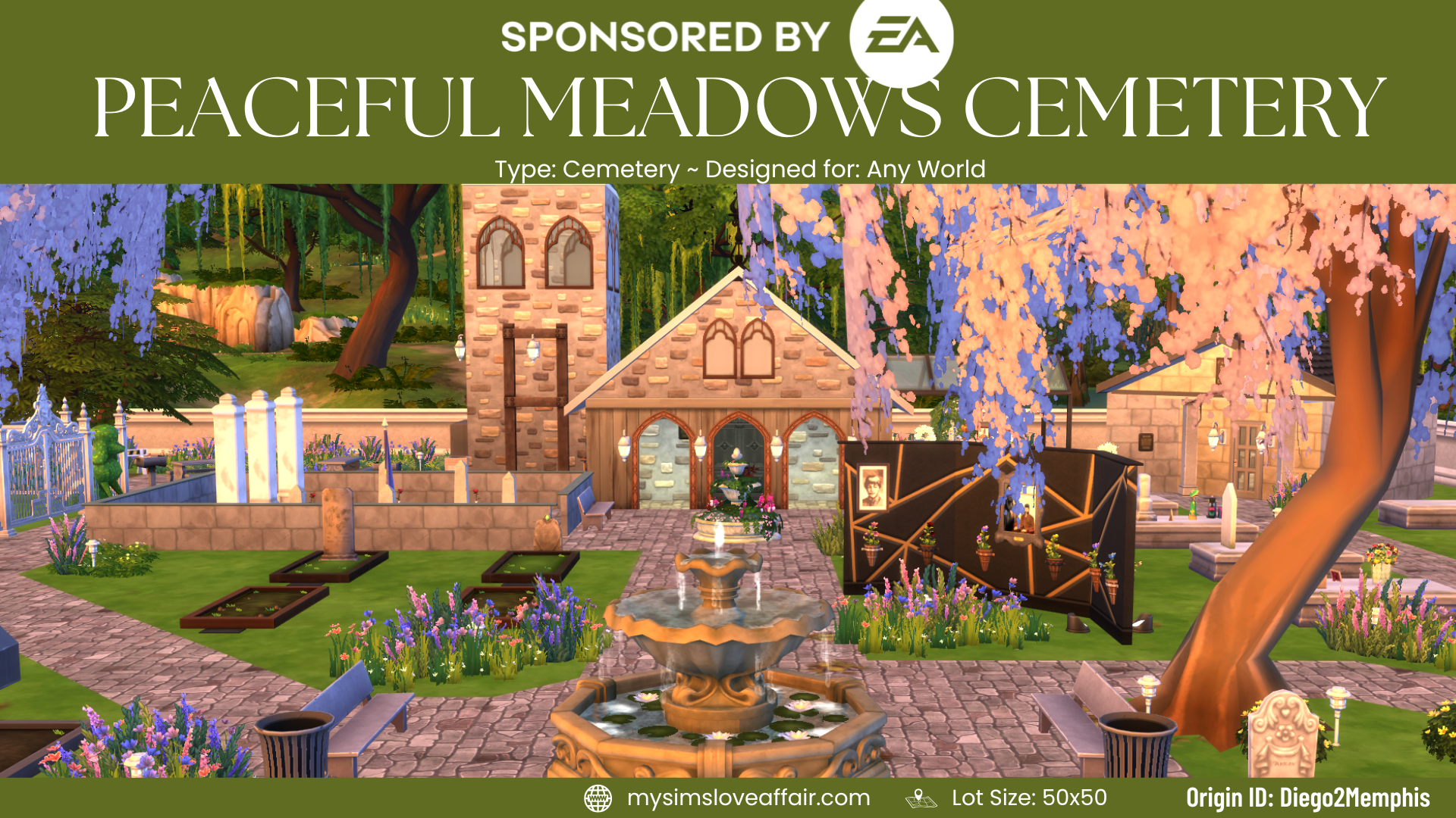 (Sponsored by EA) This is an updated version of my previously posted Peaceful Meadows Cemeteries. This legacy cemetery features areas for funerals, memorial walls, family mausoleums, a pet cemetery, and a chapel. No CC, turn on bb.moveobjects cheat.