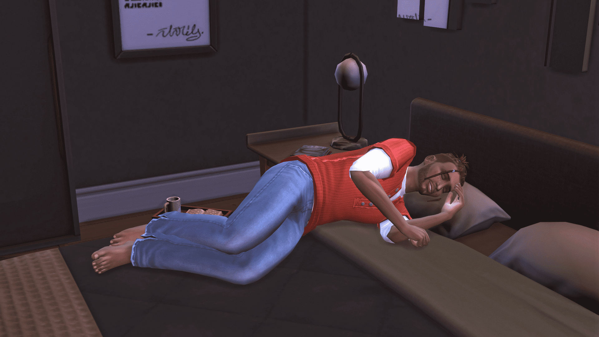 It has been a long, emotional day and I’m exhausted. I don’t have any pajamas with me, so I crawl up onto the bed in the master bedroom and sleep in my clothes.