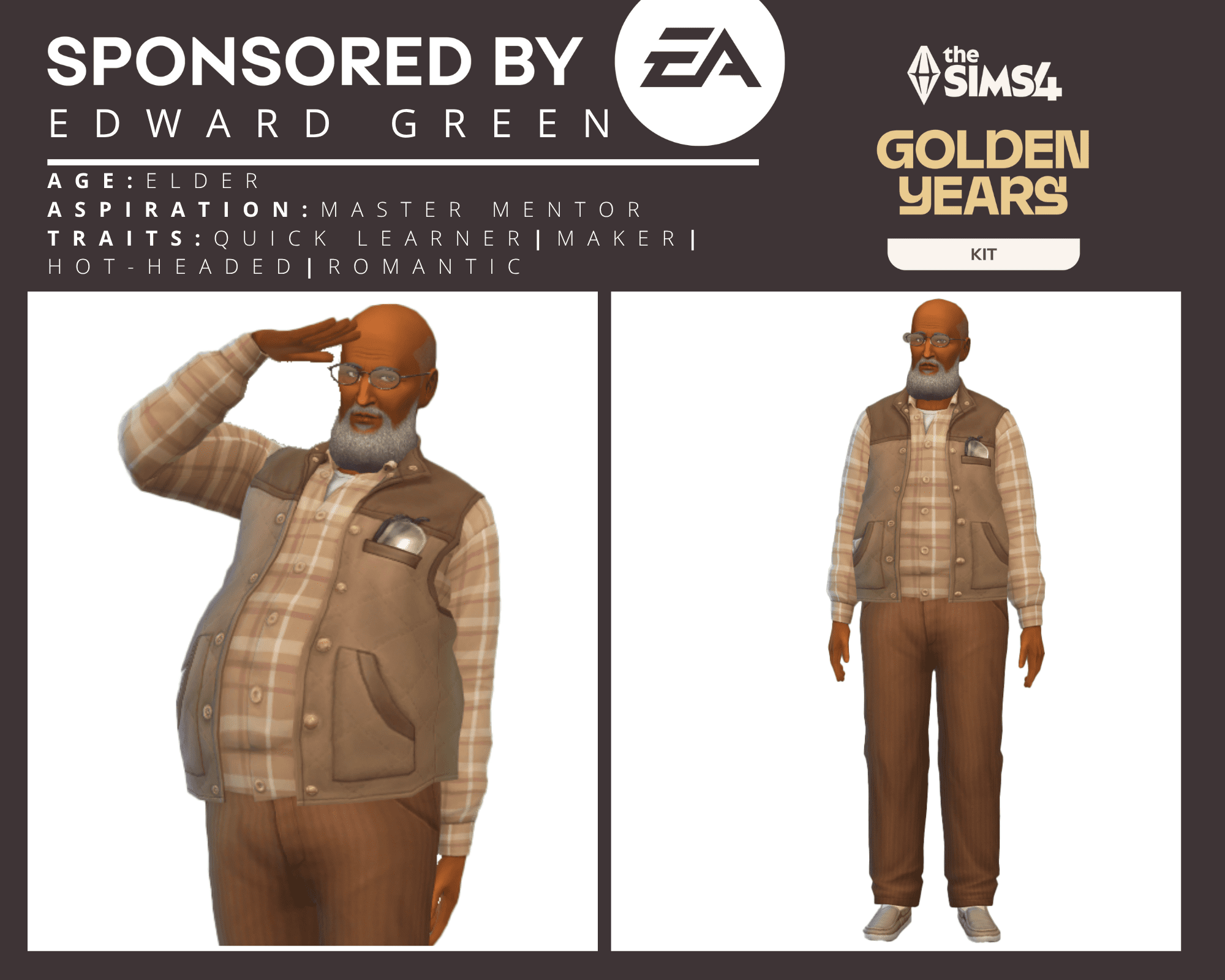 Edward Green – A #hotheaded #elder decked out in clothing from the #goldenyearskit. He’s also #romantic and is a self-proclaimed #maker. (direct gallery link)