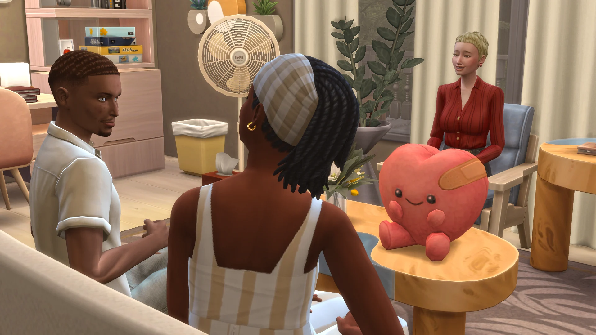 The session takes place in the nearby small town of Glimmerbrook. Maia and I arrive with a few minutes to spare. We approach the therapist’s office and check in with the receptionist before being directed to a nearby room with what looks like drama club masks on the door. It’s mildly amusing.