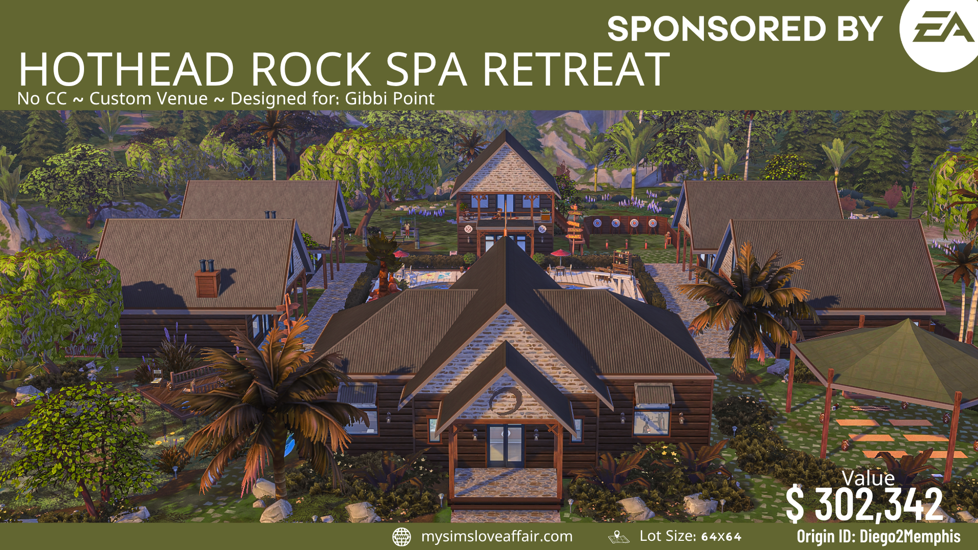 Sponsored by EA: Spa (spa staff can be hired) retreat features sauna, massage tables, hand/foot massage chairs, workout bikes, free weights, yoga. Four private cabins with bathroom, kitchenette, fireplace, and private hot tub. Large pool with diving boards, shared kitchen & upstairs staff quarters. Outdoor activities include archery, horseshoes, and more! No CC, turn on bb.moveobjects cheat.