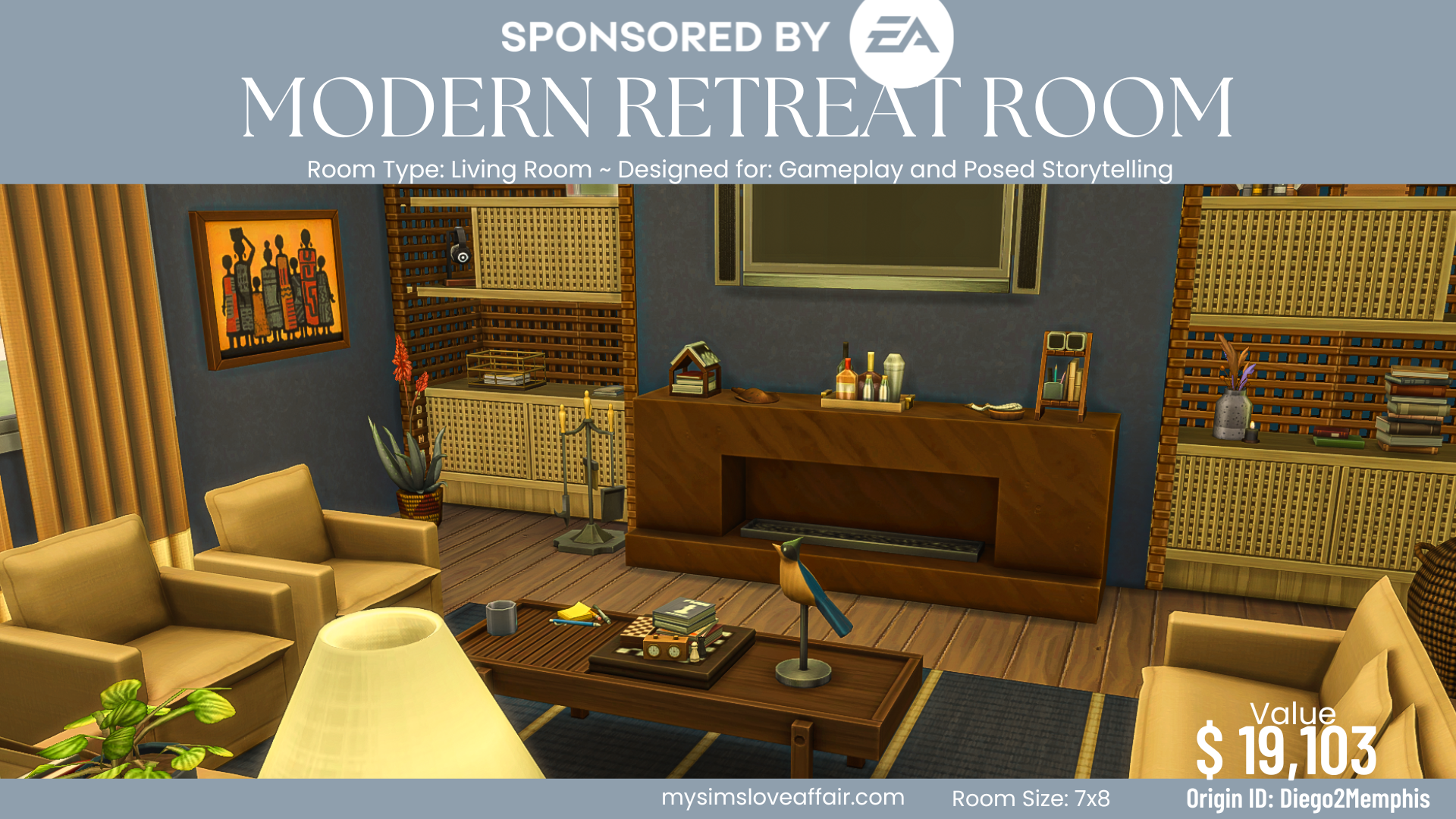 Sponsored by EA – This living room was created using the Modern Retreat Kit, Book Nook Kit, Everyday Clutter Kit, and Desert Luxe Kit. #nocc, turn on bb.moveobjects cheat